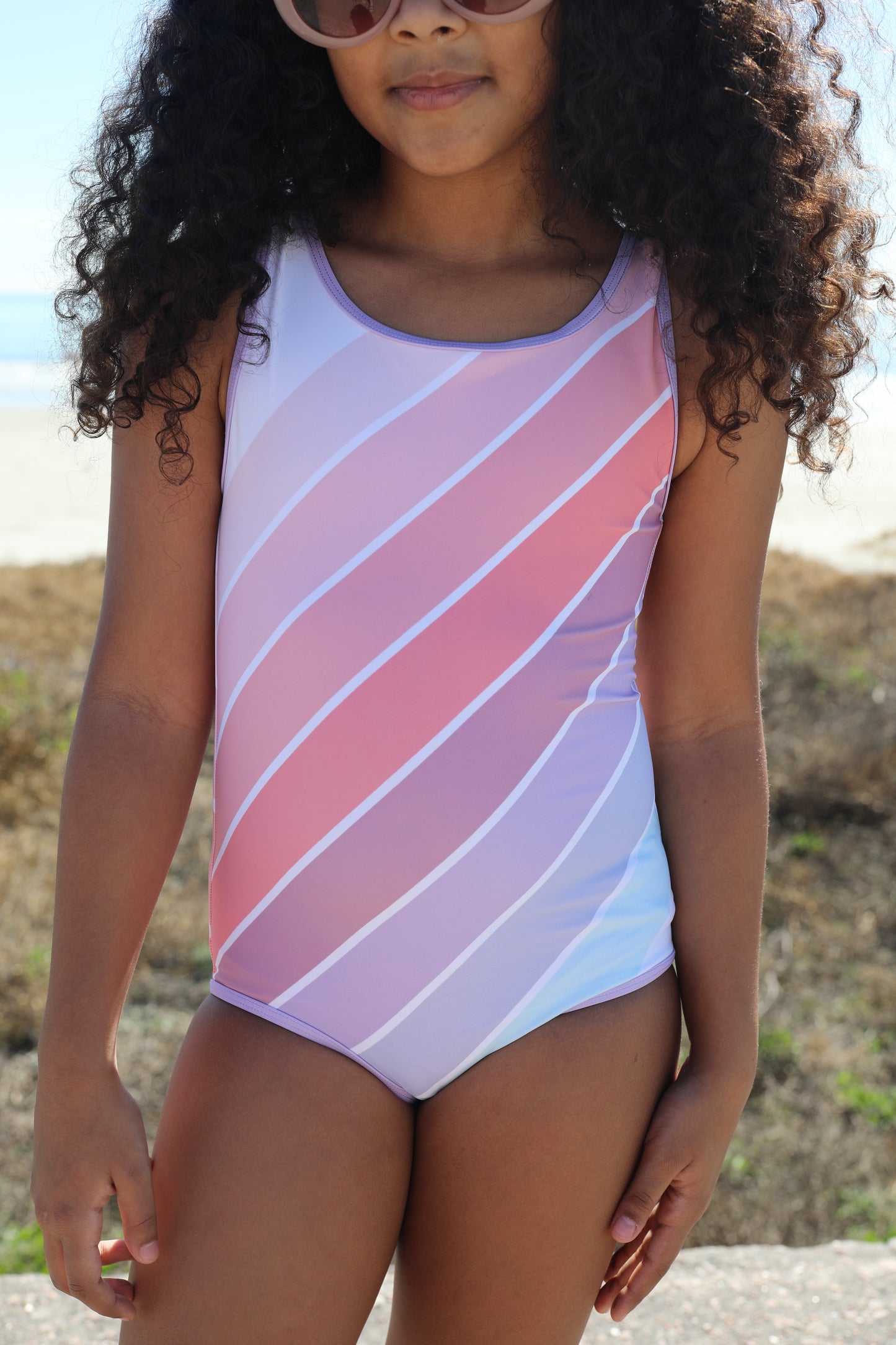 This surf lifestyle one-piece tank children's swimsuit maximizes flexibility, keeps your little one cool, and adds extra comfort for easy changing in and out while wet.