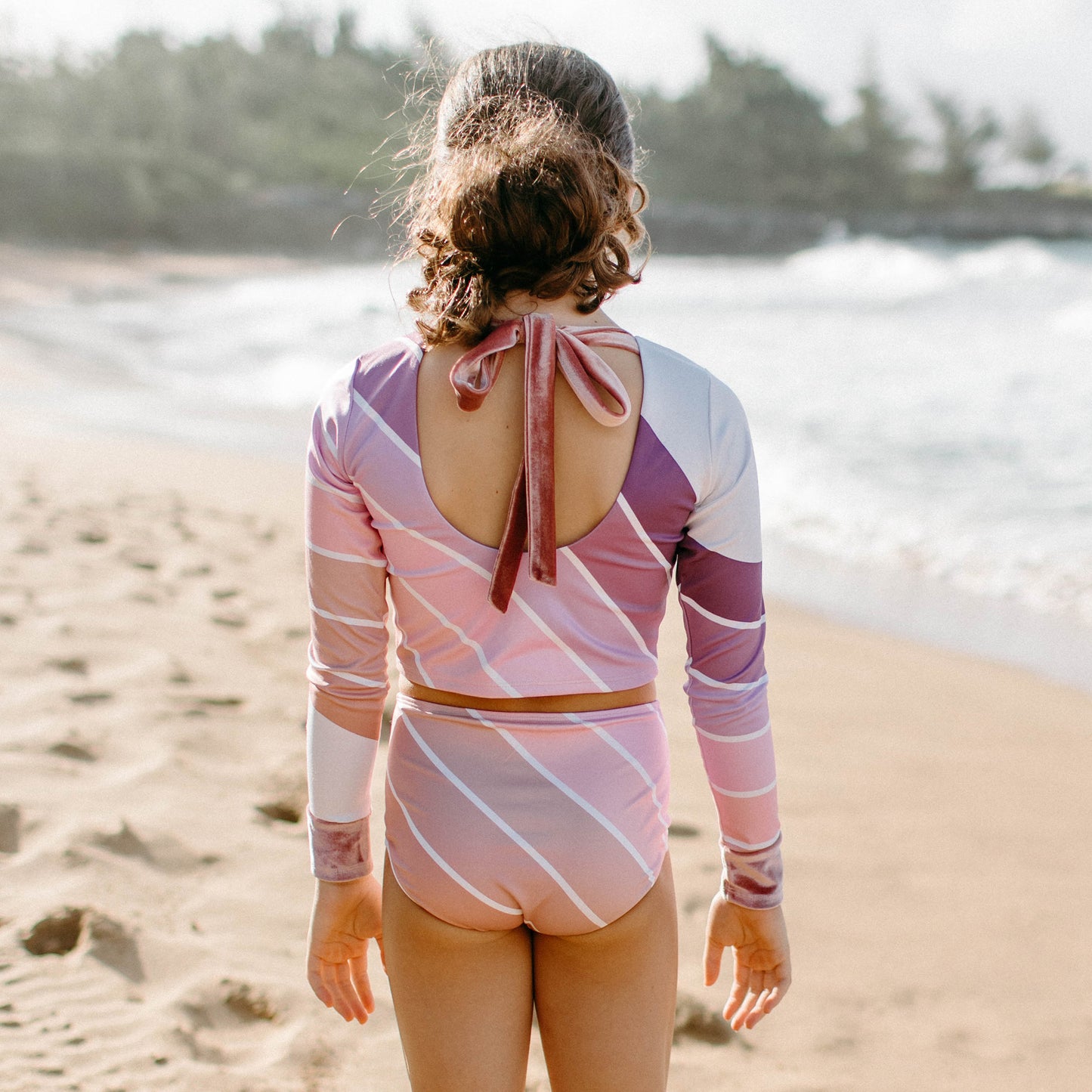 This retro style two-piece long sleeve children's swimsuit maximizes flexibility, keeps your little one cool, and adds extra comfort for easy changing in and out while wet.