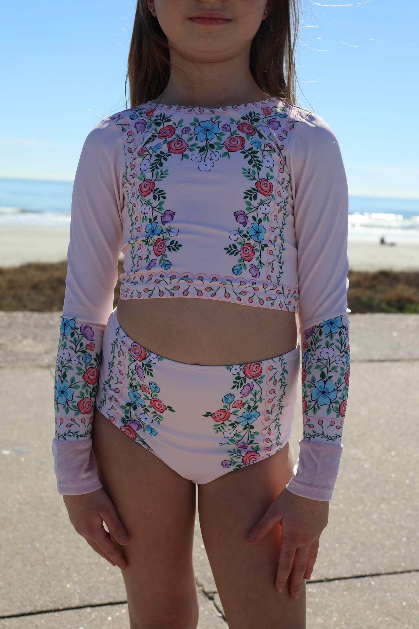 This retro style two-piece long sleeve children's swimsuit maximizes flexibility, keeps your little one cool, and adds extra comfort for easy changing in and out while wet.